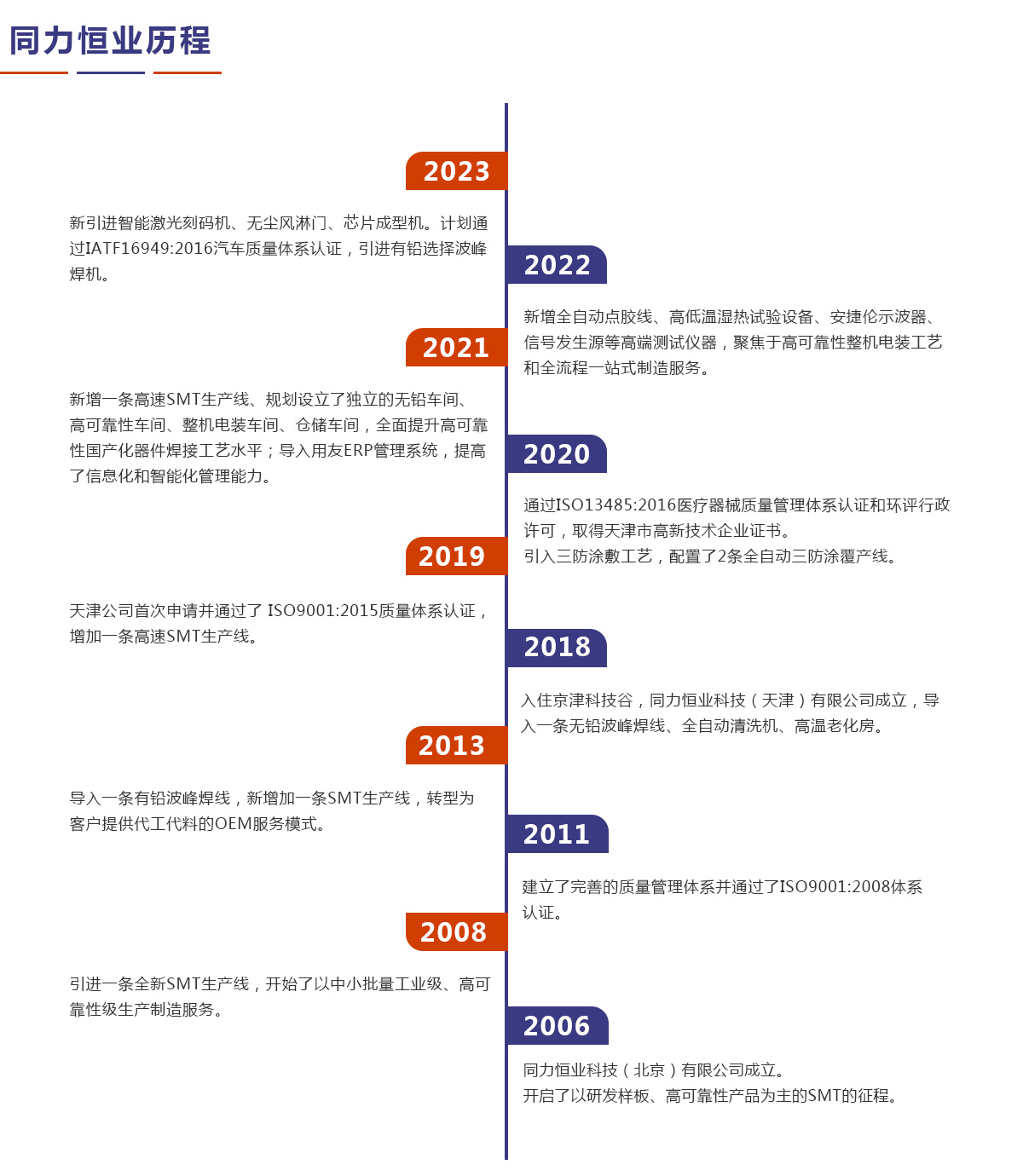 同力恒業(yè)科技成立于2006年,專業(yè)從事電子制造服務(EMS),專注于為客戶提供產品開發(fā)、工藝設計、物料配套、精密貼裝、插件焊接、三防涂敷、整機電裝、測試老化以及包裝運輸、售后維修等整個供應鏈解決方案。公司定位于高可靠性及中高端產品電子制造服務,在通訊導航、儀器儀表、醫(yī)療設備、汽車電子等領域具有豐富的一站式制造服務經(jīng)驗。